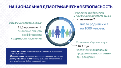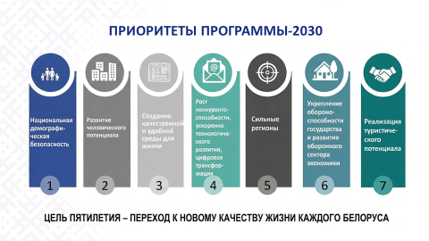 В Программе определено семь ключевых приоритетов, затрагивающих все сферы нашей жизнедеятельности. Основные из них связаны с развитием человека: демографическая безопасность, развитие человеческого потенциала, создание качественной и удобной среды для жизни. Беларусь не имеет огромных природных ресурсов, поэтому главное наше богатство – это люди, их труд, интеллект, благодаря которому мы развиваем наше государство.