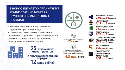 В новой пятилетке следует реализовать минимум 25 крупных инвестиционных проектов в промышленном секторе. В числе перспективных названы создание белорусского поезда в г.Фаниполе, отечественного самолета в г.Барановичах, рулонного пресс-подборщика и доильного робота, восстановление компетенций в судостроении на Пинском заводе.